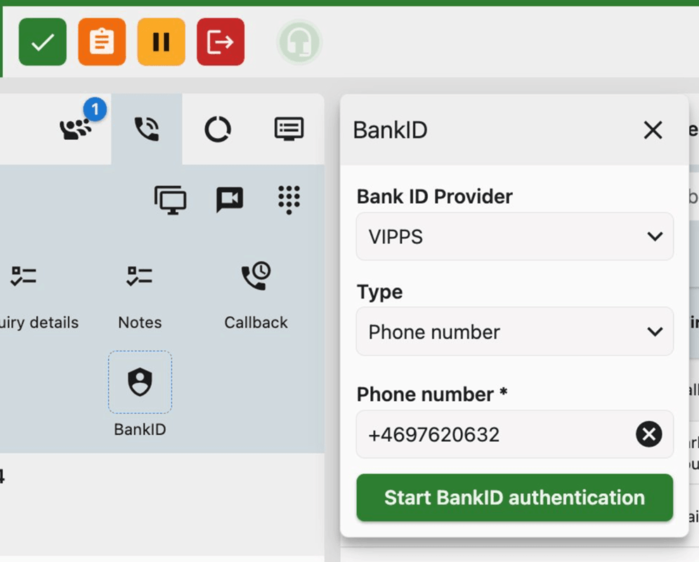 Kunder kan autentisere seg i tale (IVR eller agent). Verifisert identitet vises i samtalepanelet.